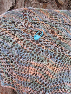 First I needed to select a yarn. I had a skein of fingering weight yarn from Schaefer Yarn in the Aung San Sui Kyi color... a luscious colorway of peach, green and blue in 50% merino wool and 50% silk called Audrey. I had intended this yarn for some special socks but a lacy shawl seemed like a better project for this yarn.